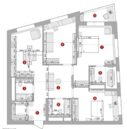 Функциональное планировочное решение включает в себя : кухню, гостиную, три спальни с встроенной мебелью, гостевой санузел с постирочной. В мастер спальне расположена ванна с окном, гардеробная зона, балкон с возможностью размещения рабочего места.