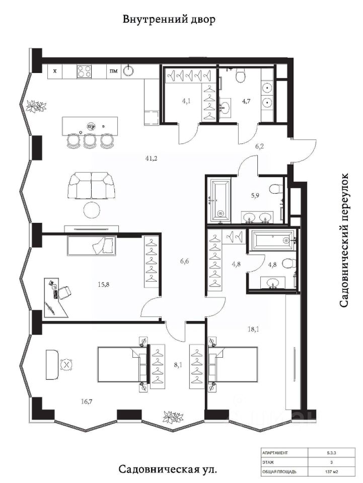 Продаются 3-комнатные апартаменты в сданном доме (Корпус 5), срок сдачи: II-кв. 2025, общей площадью 137 кв.м., на 3 этаже.