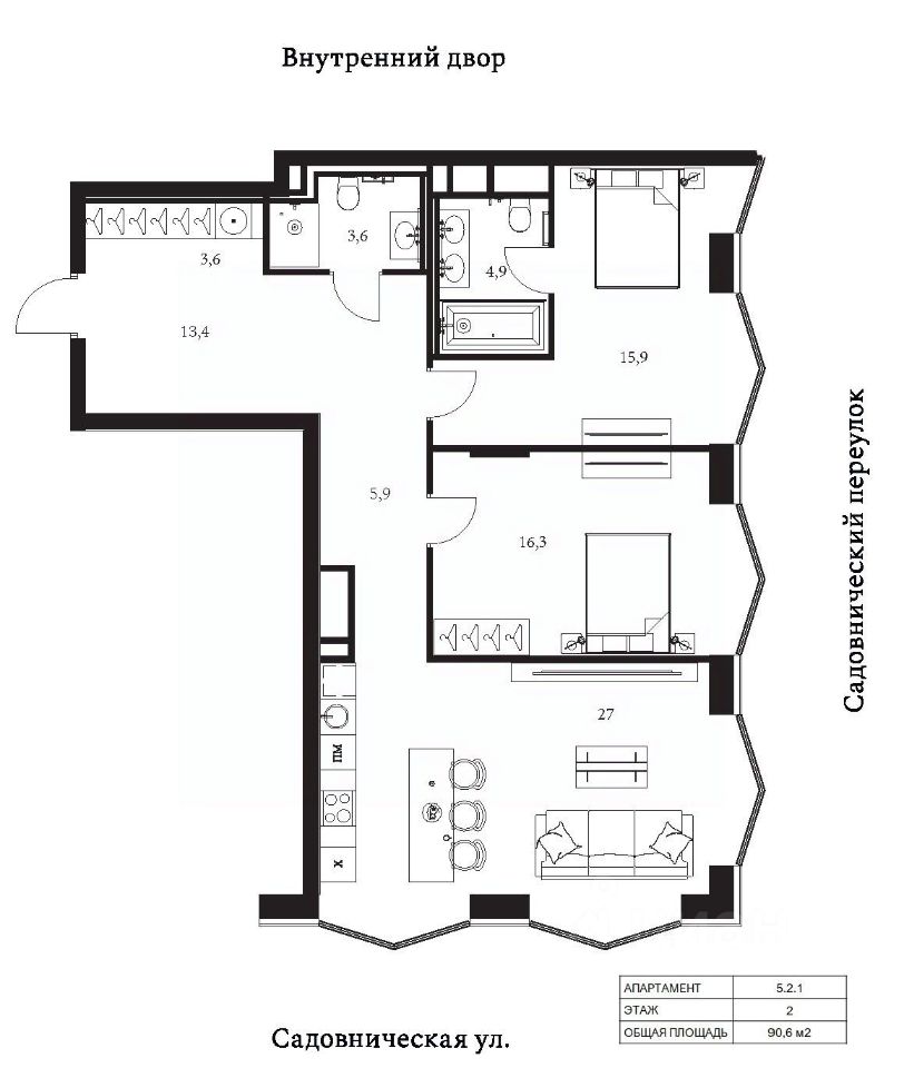 Продаются 2-комнатные апартаменты в сданном доме (Корпус 5), срок сдачи: II-кв. 2025, общей площадью 90.6 кв.м., на 4 этаже.