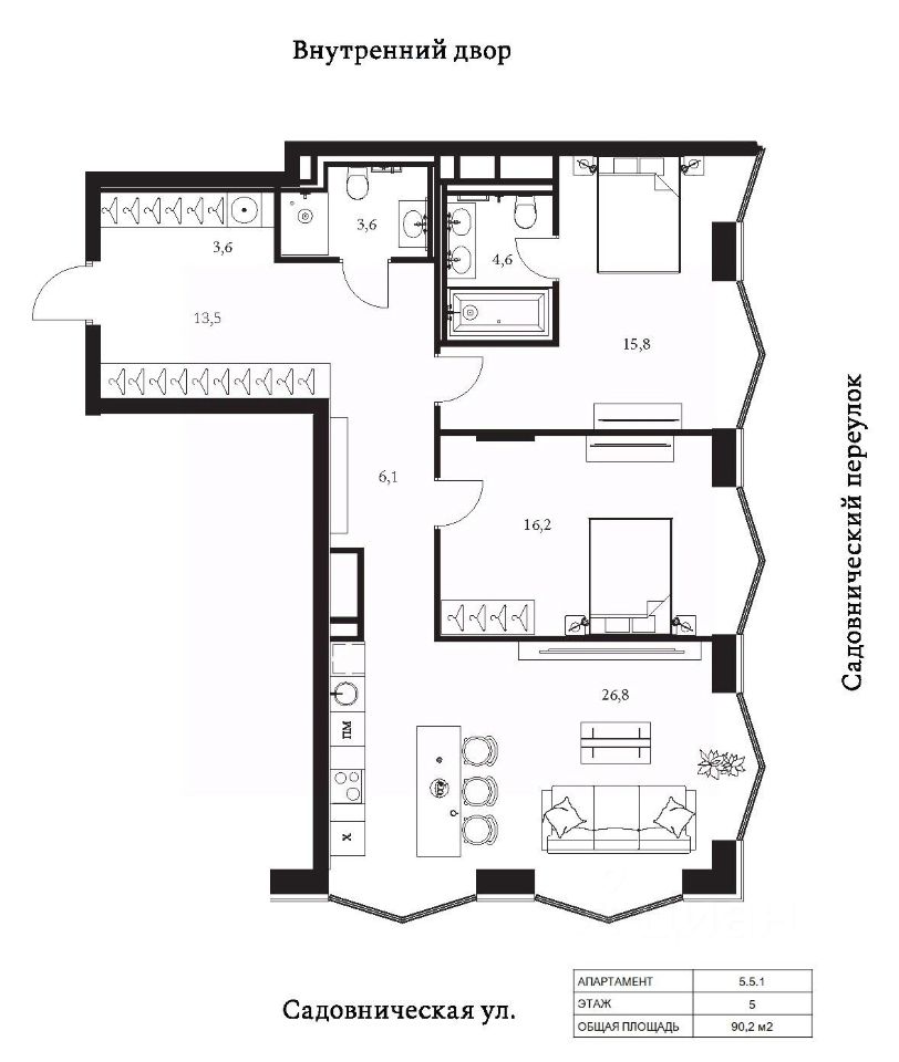 Продаются 2-комнатные апартаменты в сданном доме (Корпус 5), срок сдачи: II-кв. 2025, общей площадью 90.2 кв.м., на 5 этаже.