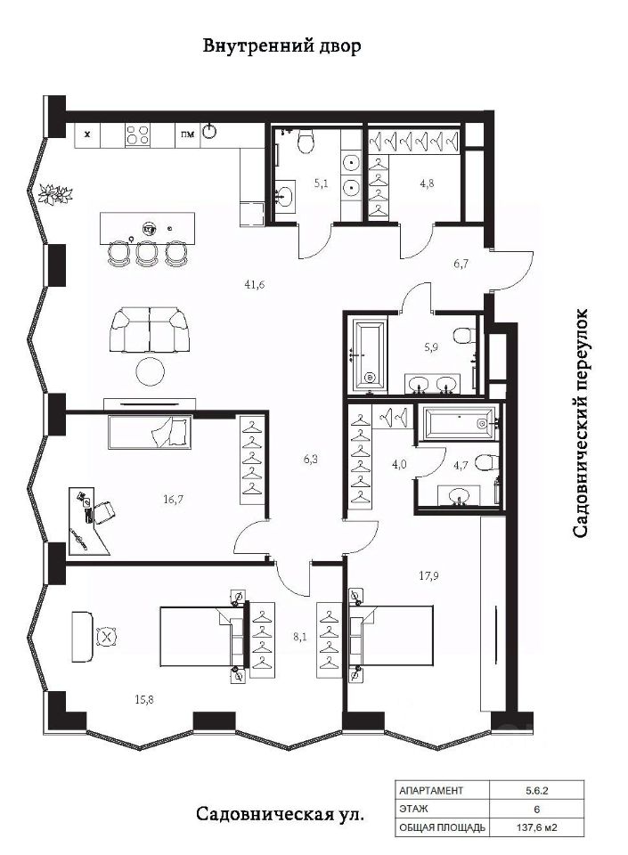 Продаются 3-комнатные апартаменты в сданном доме (Корпус 5), срок сдачи: II-кв. 2025, общей площадью 137.6 кв.м., на 6 этаже.