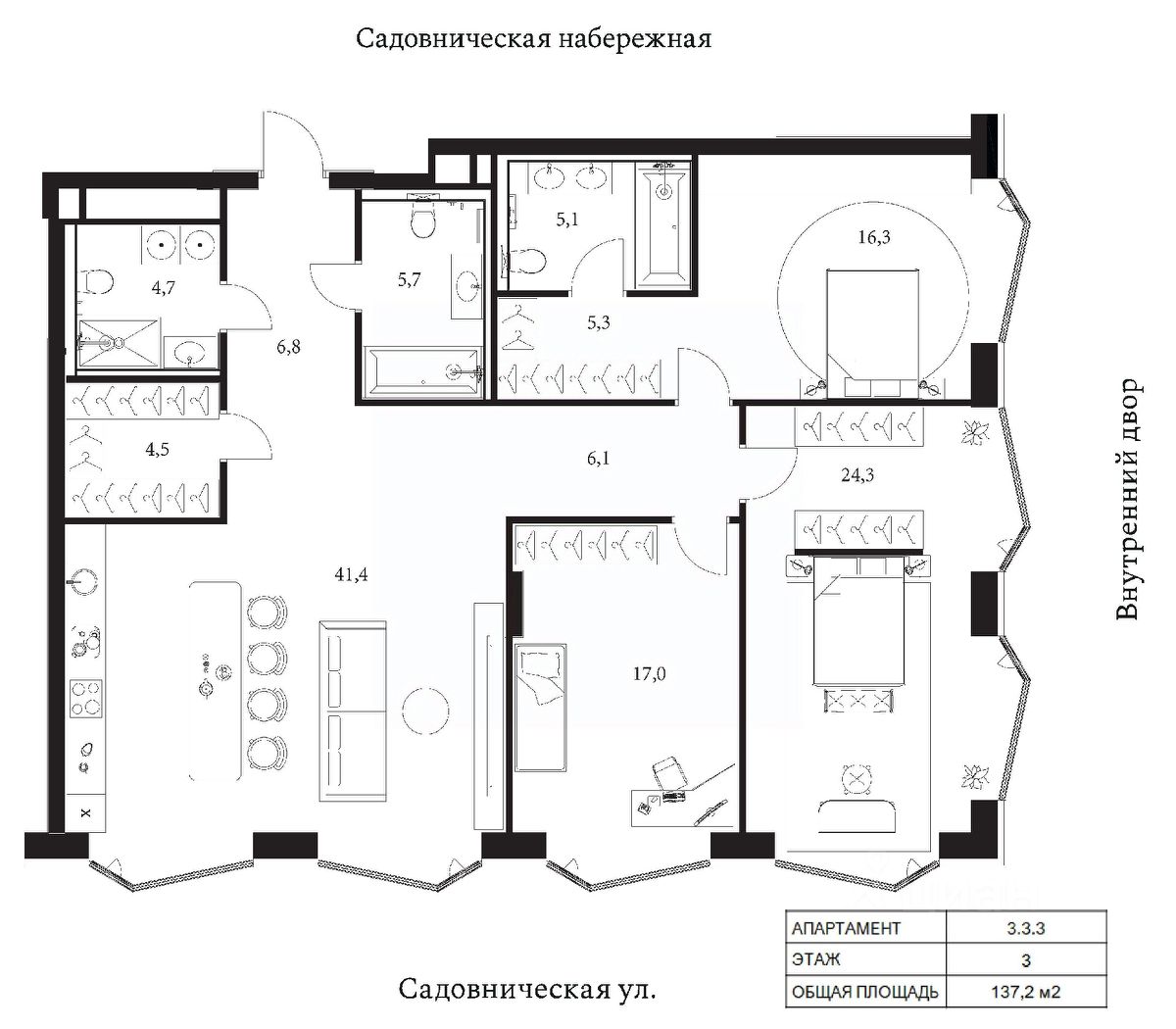 Продаются 3-комнатные апартаменты в сданном доме (Корпус 3), срок сдачи: II-кв. 2025, общей площадью 137.2 кв.м., на 7 этаже.