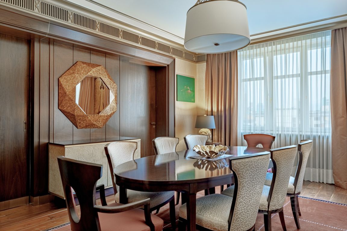В квартире выполнена премиальная отделка в стилистике современного ар-деко с использованием натуральных материалов (мрамор, дерево, на полу - дубовый паркет). Установлена мебель, техника и сантехника от ведущих мировых брендов.