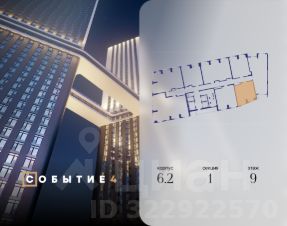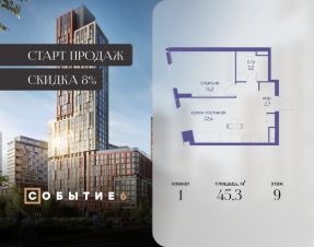 Продаётся 1-комнатная квартира от застройщика: общая площадь 45.30 м², жилая 15.20 м², кухня 22.40 м², 9-й этаж, жилой квартал "Событие-6", корпус 2 (секция 1) Срок сдачи: 1 квартал 2029 года.