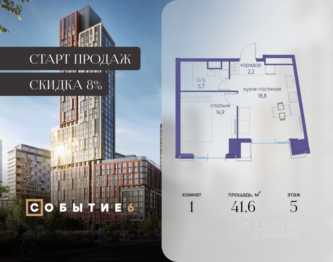 Продаётся 1-комнатная квартира от застройщика: общая площадь 41.60 м², жилая 14.90 м², кухня 18.80 м², 5-й этаж, жилой квартал "Событие-6", корпус 2 (секция 5) Срок сдачи: 1 квартал 2029 года.