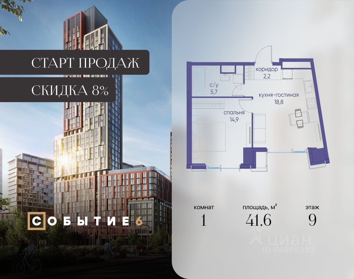 Продаётся 1-комнатная квартира от застройщика: общая площадь 41.60 м², жилая 14.90 м², кухня 18.80 м², 9-й этаж, жилой квартал "Событие-6", корпус 2 (секция 5) Срок сдачи: 1 квартал 2029 года.