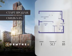 Продаётся 1-комнатная квартира от застройщика: общая площадь 51.70 м², жилая 16.90 м², кухня 25.90 м², 18-й этаж, жилой квартал "Событие-6", корпус 2 (секция 1) Срок сдачи: 1 квартал 2029 года.