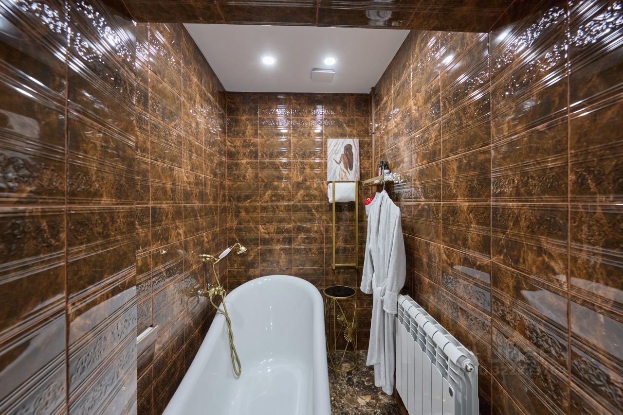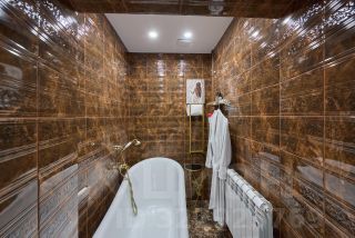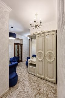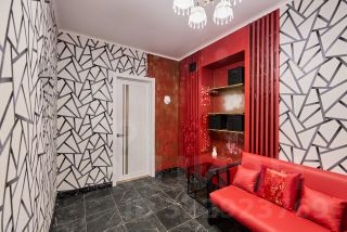Широкий и длинный коридор разделяет кухню и ванную комнаты по дороге в гостиную (или спальню). Ярко-красный лофт с геометрией в гардеробной, благородная коричневая классика в спальне, современный стиль или всеми полюбившаяся простота присутствует в желто-черной кухне, ненавязчивое барокко нежно блестит золото-розовыми оттенками в длинном коридоре и пестрит золотыми ножками в ванной комнате.