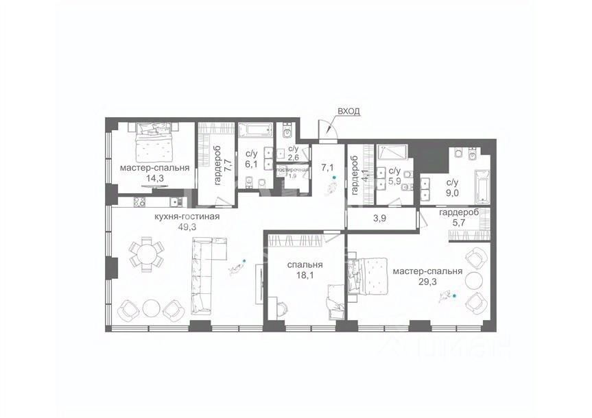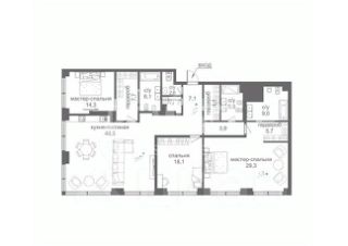 Возможная планировка: кухня-гостиная, расположенная в угловой части квартиры, из которой открывается прекрасный вид на воду и набережную, три спальни, две из которых со своими гардеробными и санузлами, совмещенный санузел, гостевой санузел, постирочная, прихожая.