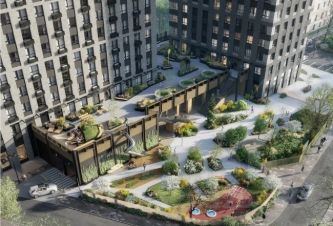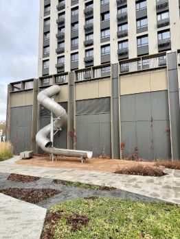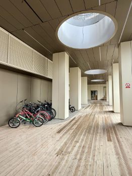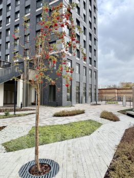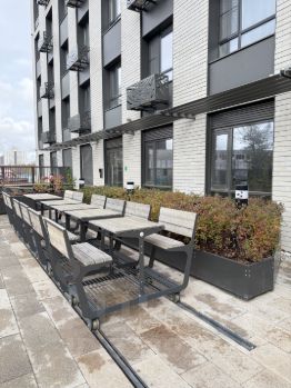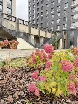 Пространство двора на территории 5934 м² предлагает широкие возможности для творческой и физической активности зимой и летом: игровые и спортивные площадки, зоны для работы и отдыха на свежем воздухе , летний кинотеатр и сцена (площадка для йоги), крытая стоянка для велосипедов и даже небольшой лаунж.