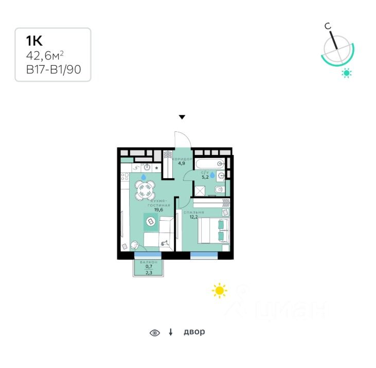 Продаётся Евро-2-комнатная квартира с чистовой отделкой в стиле Scandinavian общей площадью 42,6 кв. м. С просторной кухней-гостиной 19,6 кв. м и уютной комнатой 12.2. кв.м. Квартира расположена на 3 этаже 6 -этажного дома класса Balanced, вид из окон во двор.