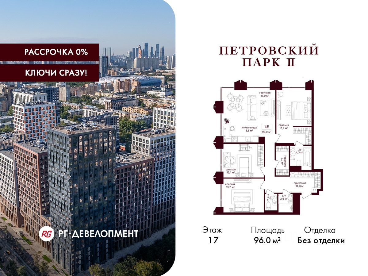 Продаётся 3-комнатная квартира 96.0 кв.м. в ЖК "Петровский парк II" на 17-м этаже 25 этажного дома.