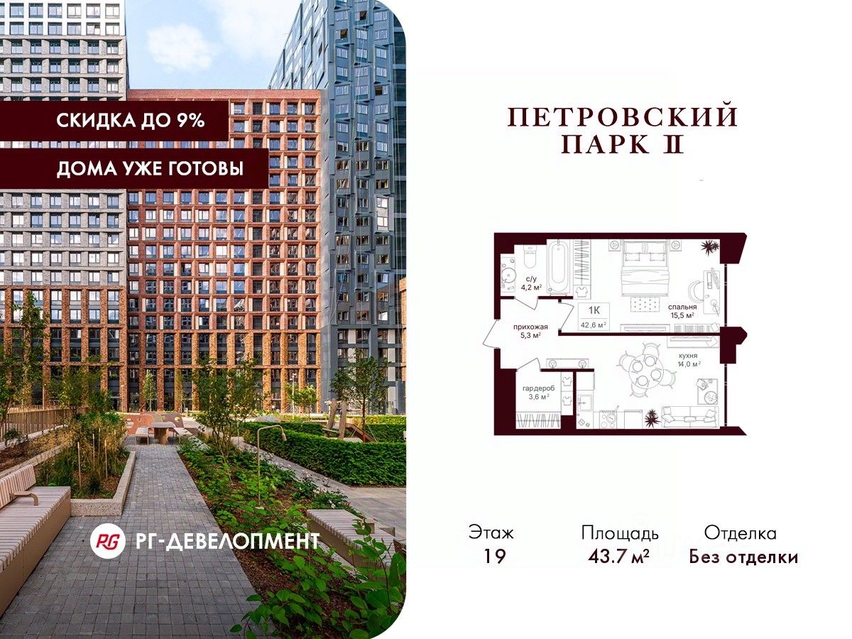 Продаётся 1-комнатная квартира 43,7 кв.м. в ЖК "Петровский парк II" на 19-м этаже 19 этажного дома.