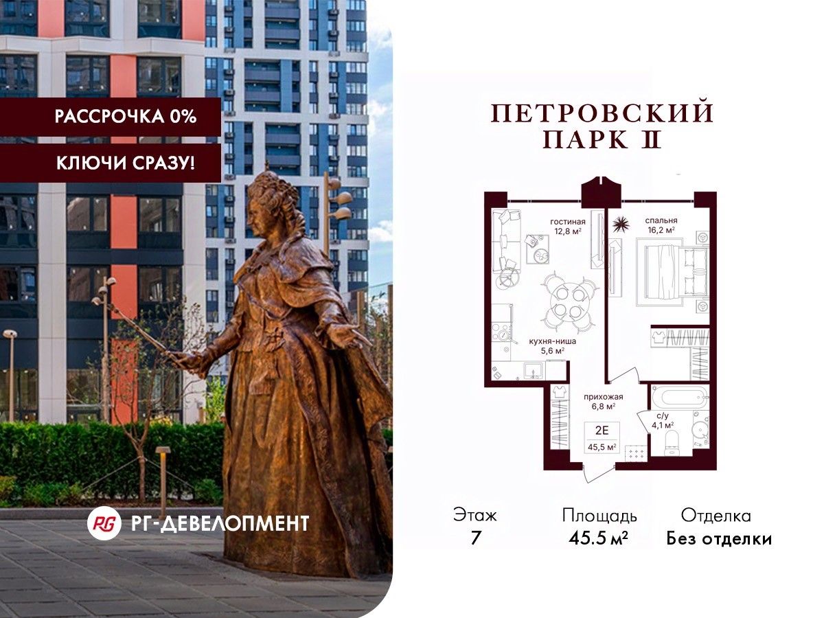 Продаётся 1-комнатная квартира 45.5 кв.м. в ЖК "Петровский парк II" на 7-м этаже 25 этажного дома.