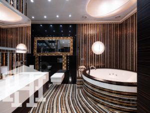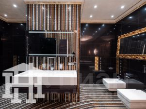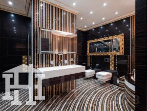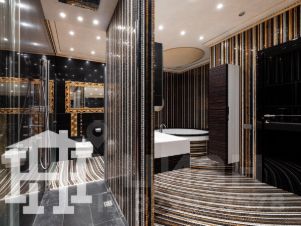Планировка квартиры включает просторную гостиную, объединенную с кухней, 2 спальни, кабинет, санузел с джакузи и тропическим душем, гостевой санузел с душевой и большую прачечную.