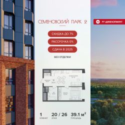 Продается 1-к квартира 39,1 кв.м. в ЖК "Семеновский парк 2" на 20-м этаже 26 этажного дома.