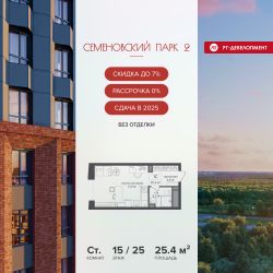 Продается студия 25,4 кв.м. в ЖК "Семеновский парк 2" на 15-м этаже 25 этажного дома.