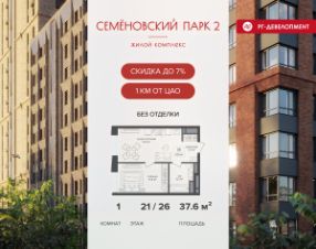 Продается 1-к квартира 37,6 кв.м. в ЖК "Семеновский парк 2" на 21-м этаже 26 этажного дома.