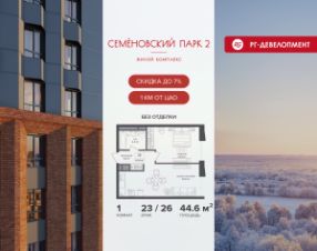 Продается 1-к квартира 44,6 кв.м. в ЖК "Семеновский парк 2" на 23-м этаже 26 этажного дома.
