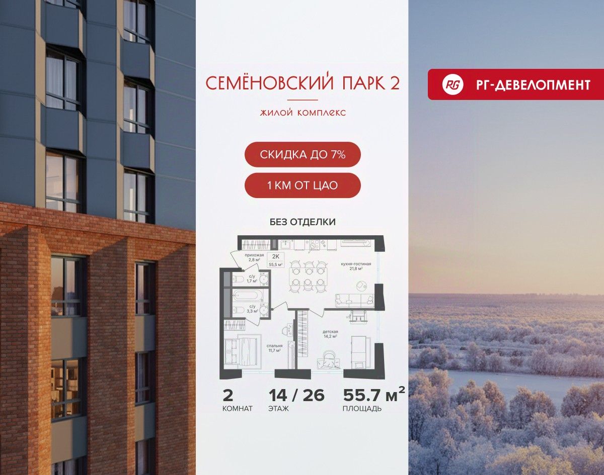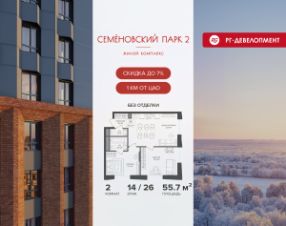 Продается 2-к квартира 55,5 кв.м. в ЖК "Семеновский парк 2" на 14-м этаже 26 этажного дома.