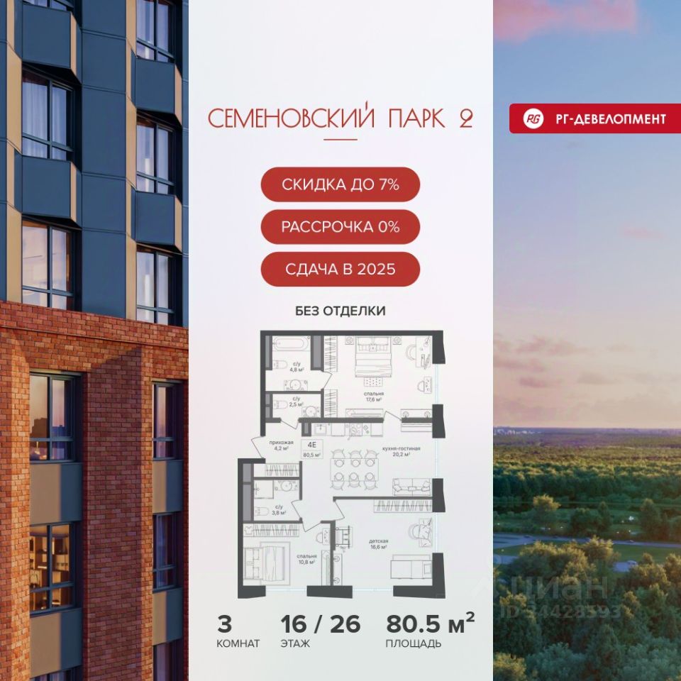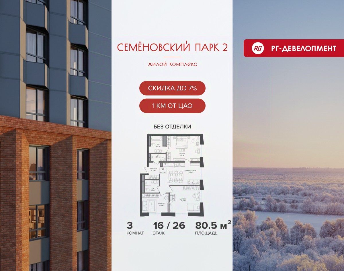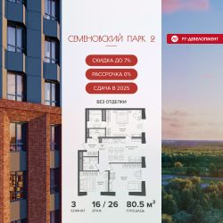 Продается 3-к квартира 80,5 кв.м. в ЖК "Семеновский парк 2" на 16-м этаже 26 этажного дома.
