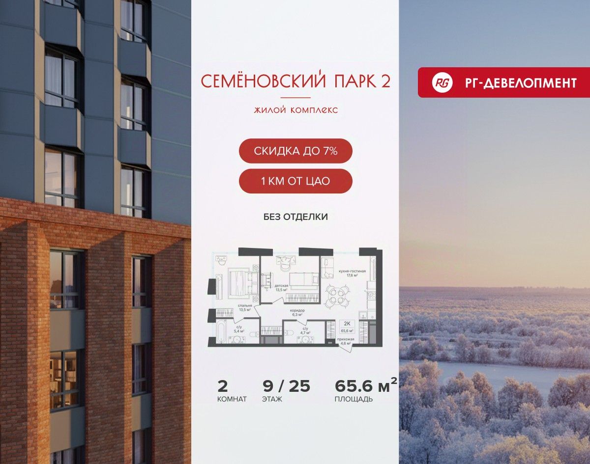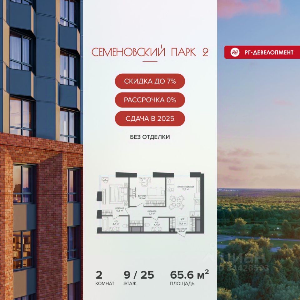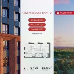 Продается 2-к квартира 65,6 кв.м. в ЖК "Семеновский парк 2" на 9-м этаже 25 этажного дома.