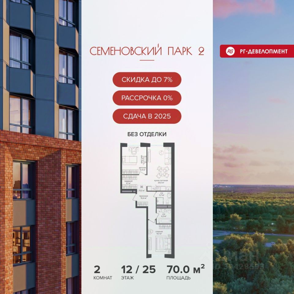 Продается 2-к квартира 70,0 кв.м. в ЖК "Семеновский парк 2" на 12-м этаже 25 этажного дома.