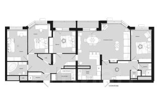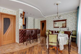 Квартира отличается функциональной планировкой: просторная гостиная-столовая, объединенная с кухней-нишей, четыре изолированные комнаты, два полноценных санузла, прачечная и кладовая. Все помещения имеют правильные пропорции и обеспечивают высокий уровень комфорта для проживания семьи.
