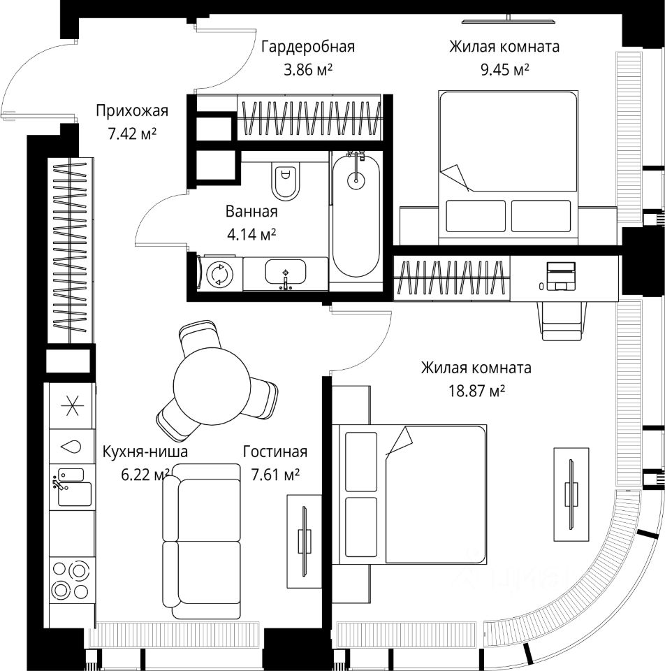 Продаётся 2-комнатная квартира общей площадью 57.57 м² без отделки в ЖК VEER на 20-м этаже 25 этажного дома.