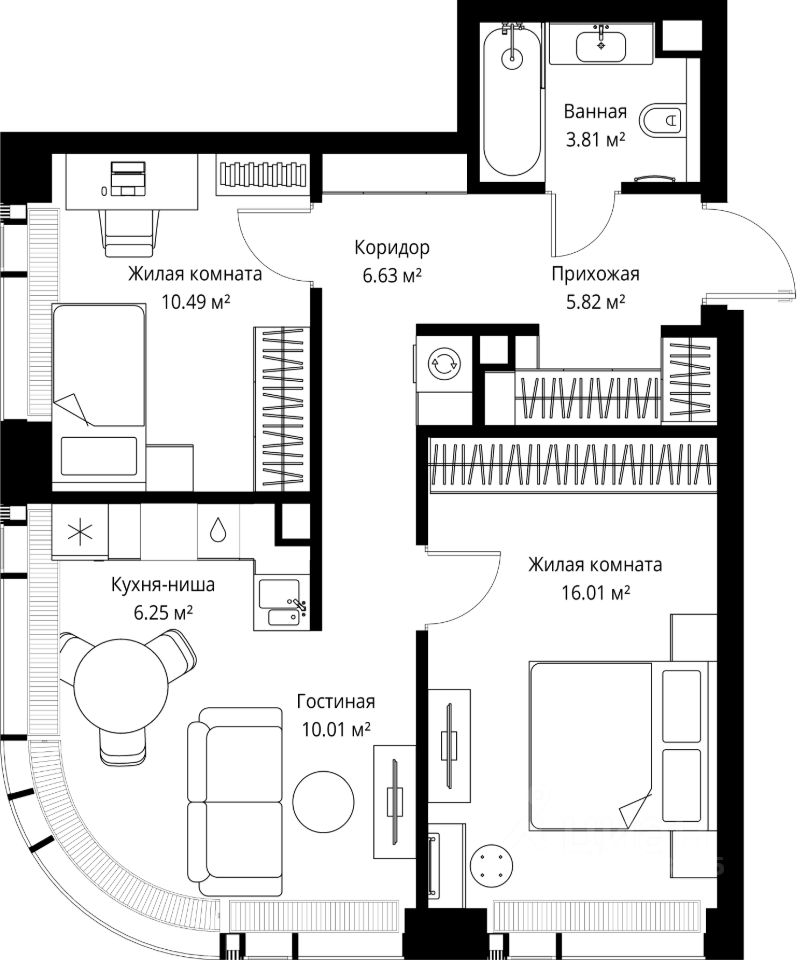 Продаётся 2-комнатная квартира общей площадью 59.02 м² без отделки в ЖК VEER на 14-м этаже 25 этажного дома.
