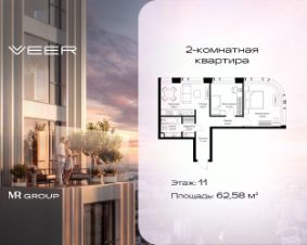 Продаётся 2-комнатная квартира общей площадью 62.58 м² без отделки в ЖК VEER на 11-м этаже 25 этажного дома.