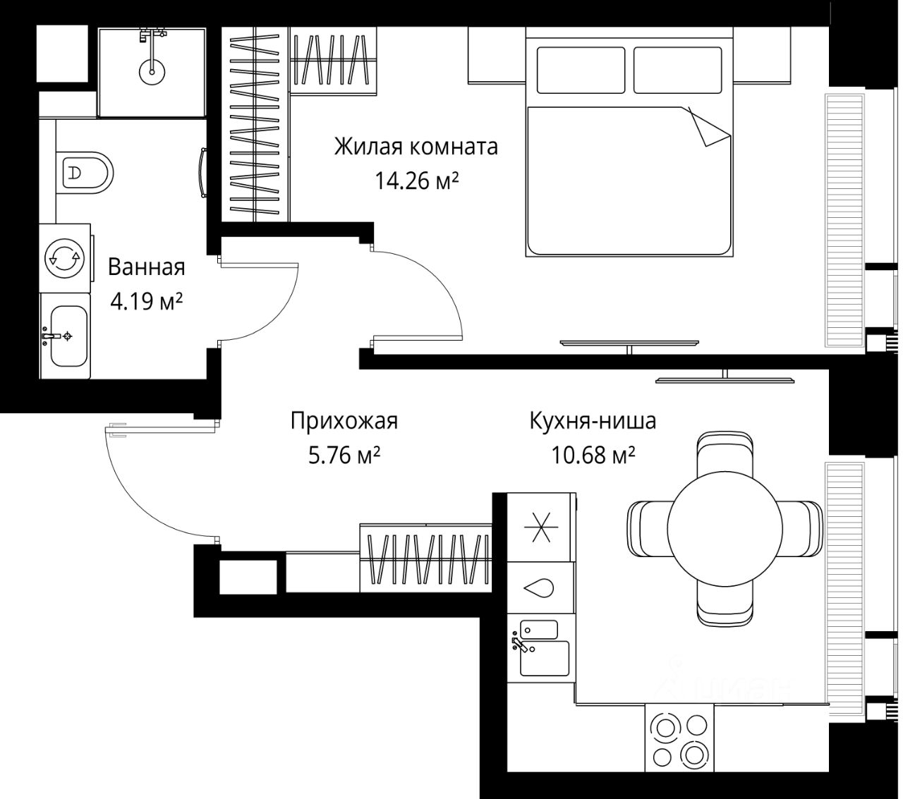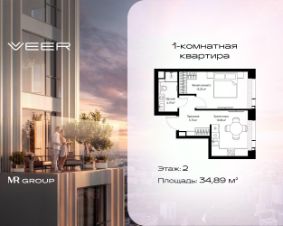 Продаётся 1-комнатная квартира общей площадью 34.89 м² без отделки в ЖК VEER на 2-м этаже 25 этажного дома.