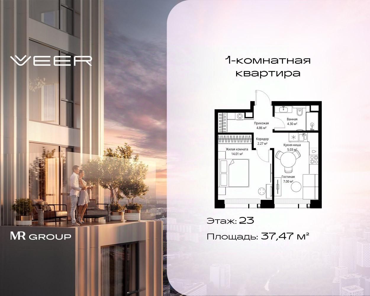 Продаётся 1-комнатная квартира общей площадью 37.47 м² без отделки в ЖК VEER на 23-м этаже 25 этажного дома.