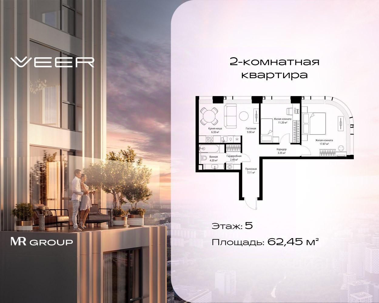 Продаётся 2-комнатная квартира общей площадью 62.45 м² без отделки в ЖК VEER на 5-м этаже 25 этажного дома.