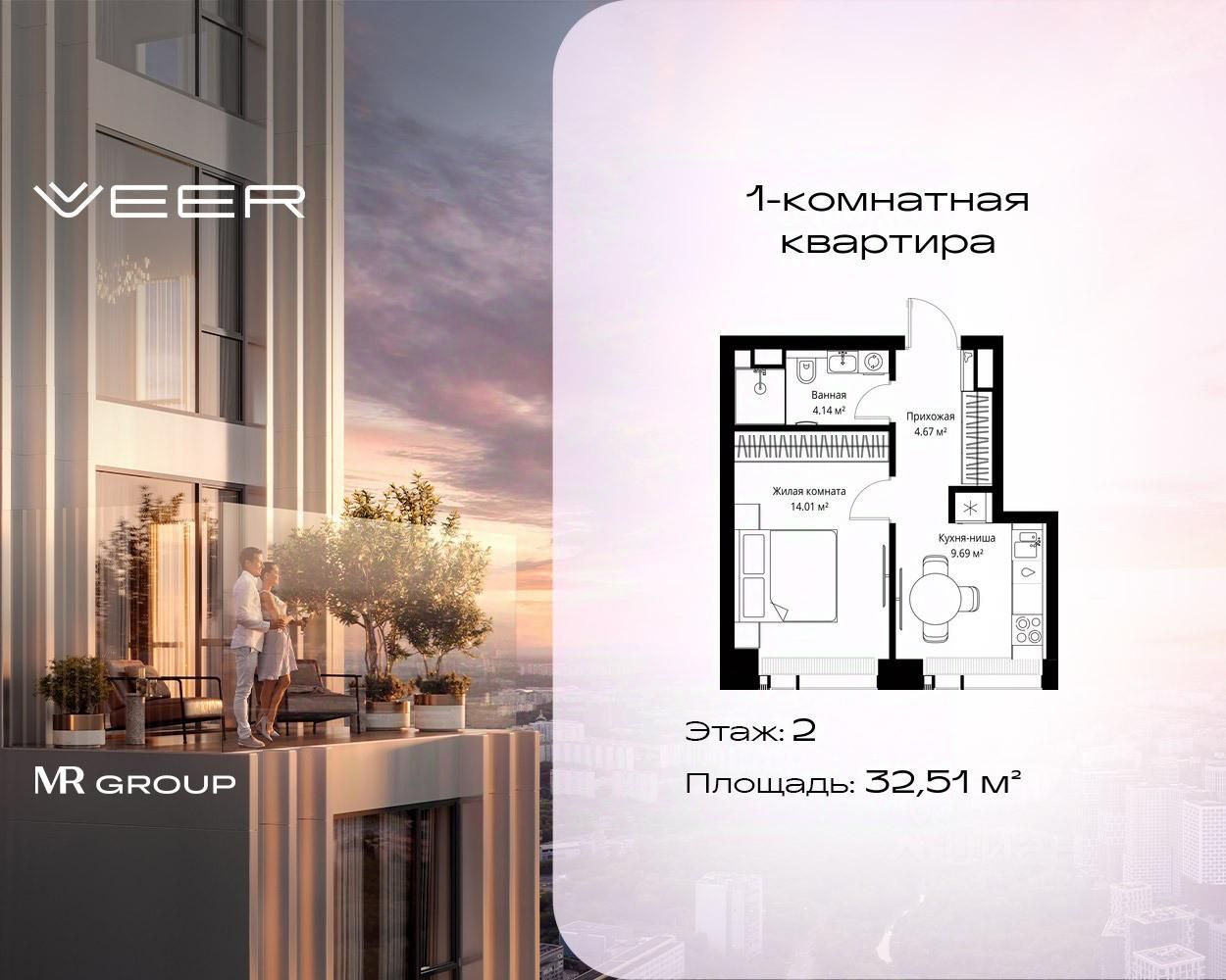Продаётся 1-комнатная квартира общей площадью 32.51 м² без отделки в ЖК VEER на 2-м этаже 59 этажного дома.