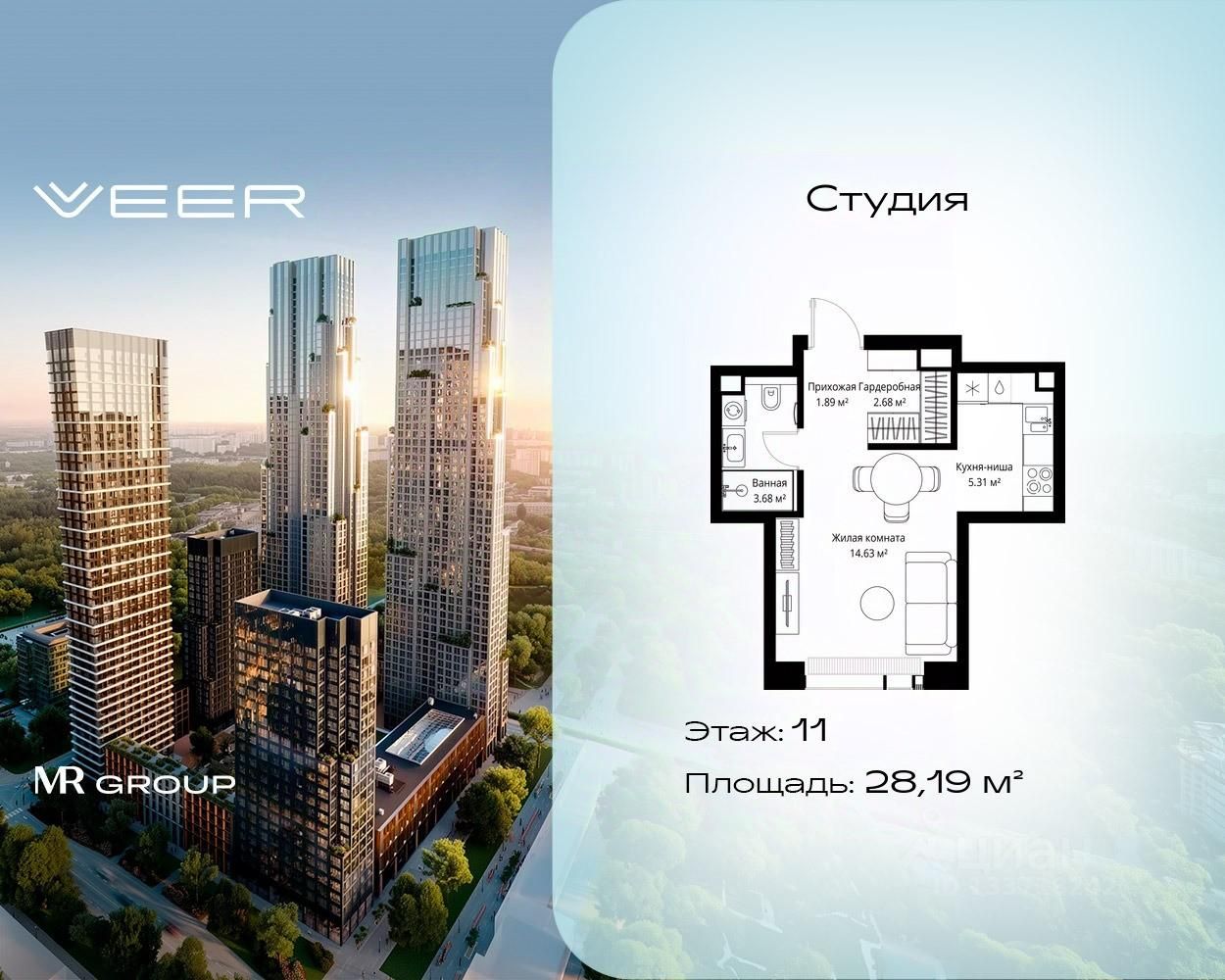 Продаётся студия общей площадью 28.19 м² без отделки в ЖК VEER на 11-м этаже 25 этажного дома.
