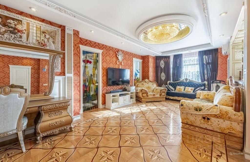 В квартире выполнен дизайнерский ремонт в стиле "барокко" с использованием премиальных материалов, на полу выложен паркет из дуба с инкрустацией красного дерева, потолки украшены лепниной из гипса.