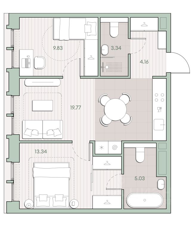 Максимально удобная планировка, с большой кухней гостиной, мастер спальней с гардеробной и большим санузлом, а так же детской комнатой (или кабинетом). Из панорамных окон открытый вид на запад (много зелени и солнца во второй половине дня). Высокие потолки: 3,02 метра.