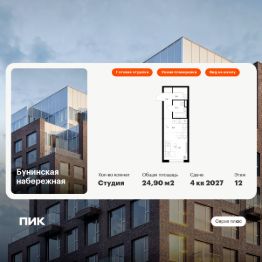 Продаётся квартира-студия площадью 24,9 кв.м на 12 этаже 16 этажного дома (Корпус 2.6/1.4, Секция 4) проекта ПИК Бунинская набережная. Светлый просторный подъезд на уровне земли, функциональная планировка, большие окна, c отделкой.