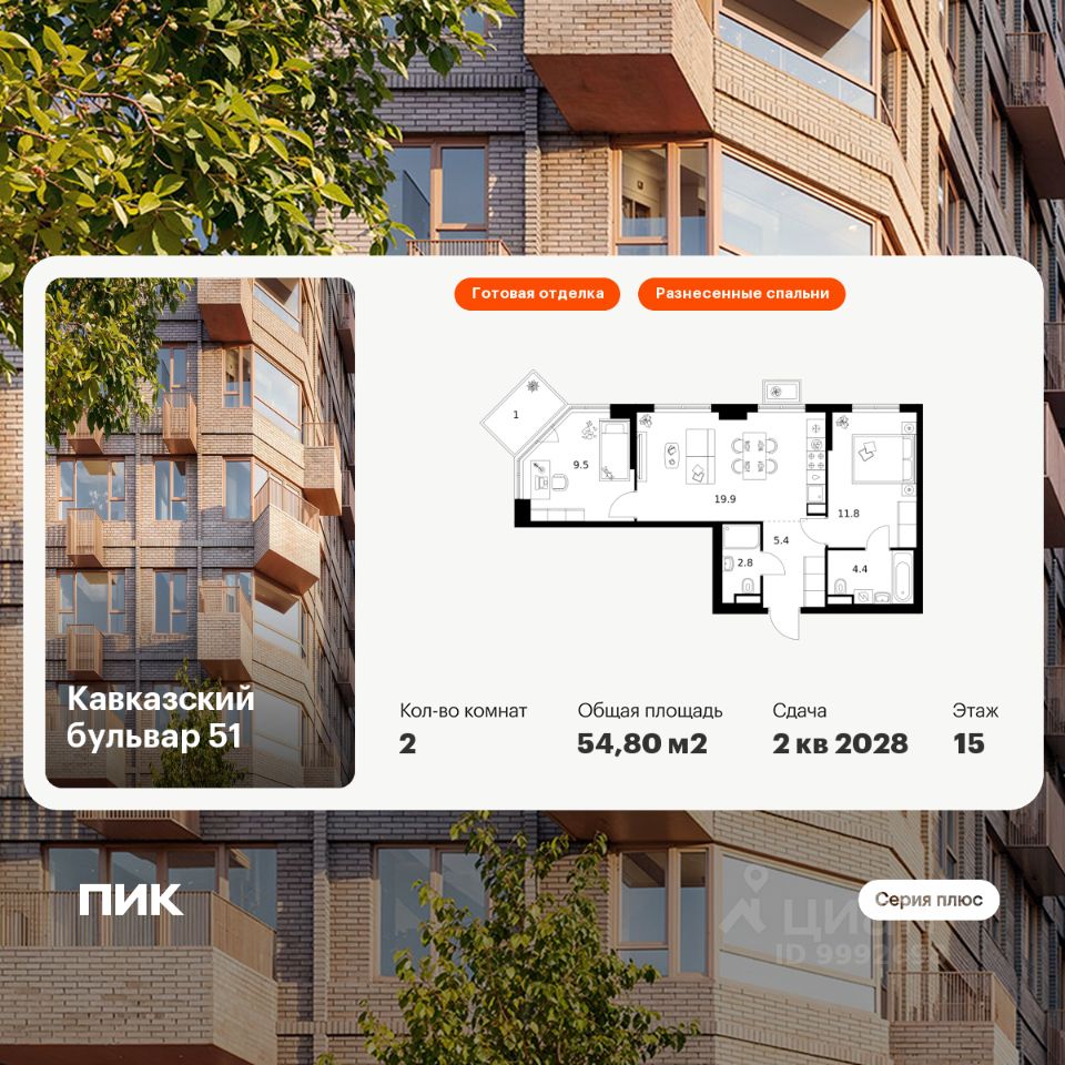 Продаётся 2-комн. квартира площадью 54,8 кв.м на 15 этаже 23 этажного дома (Корпус 3.1, Секция 1) проекта ПИК Кавказский бульвар 51. Светлый просторный подъезд на уровне земли, функциональная планировка, большие окна, c отделкой.