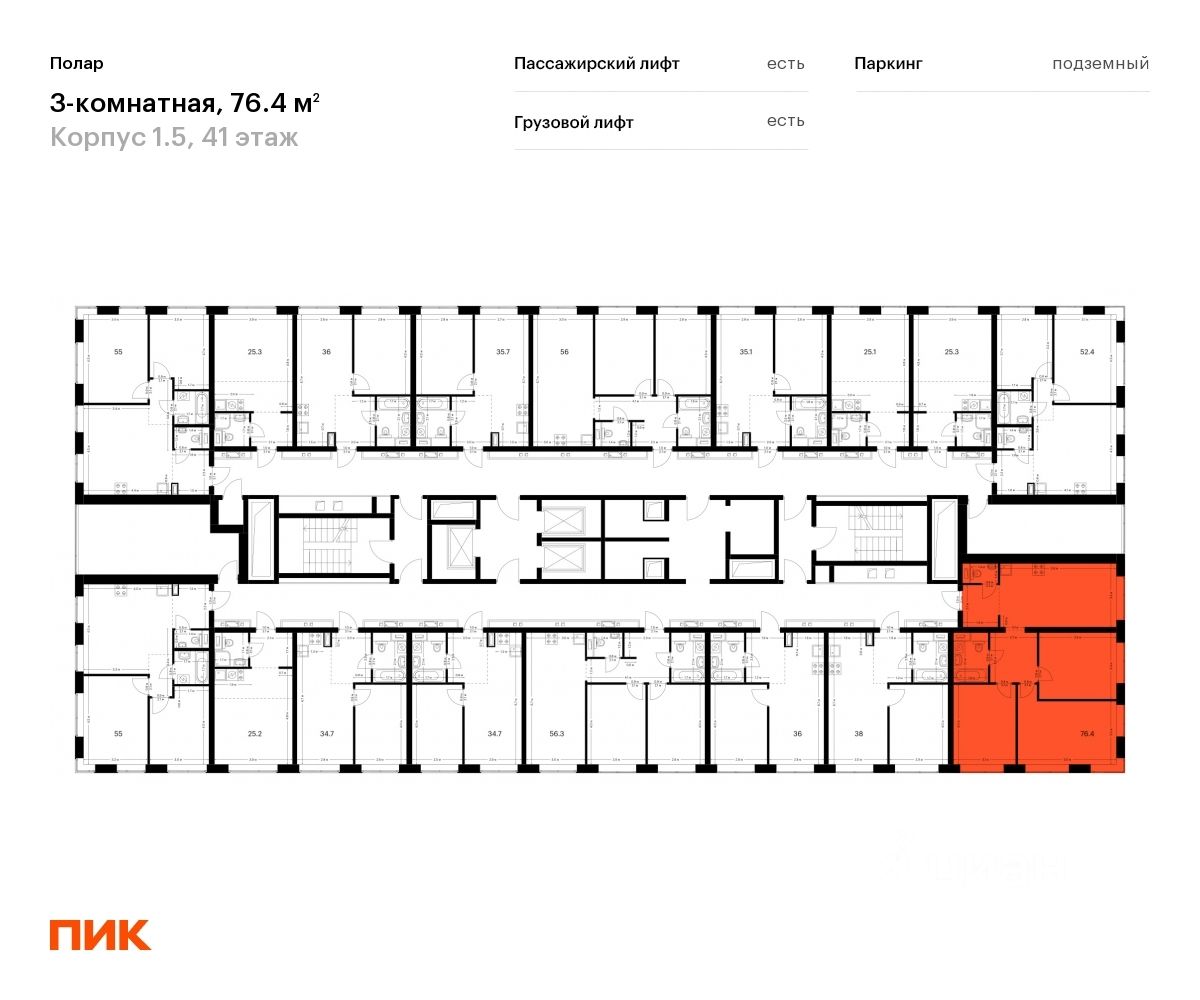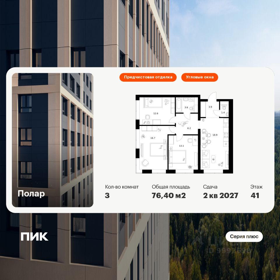 Продаётся 3-комн. квартира площадью 76,4 кв.м на 41 этаже 50 этажного дома (Корпус 1.5, Секция 2) проекта ПИК Полар. Светлый просторный подъезд на уровне земли, функциональная планировка, большие окна, предчистовая отделка.