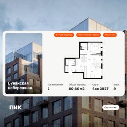 Продаётся 2-комн. квартира площадью 60,6 кв.м на 9 этаже 16 этажного дома (Корпус 2.6/1.3, Секция 3) проекта ПИК Бунинская набережная. Светлый просторный подъезд на уровне земли, функциональная планировка, большие окна, c отделкой.