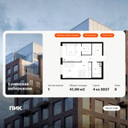 Продаётся 1-комн. квартира площадью 41,9 кв.м на 8 этаже 16 этажного дома (Корпус 2.6/1.2, Секция 2) проекта ПИК Бунинская набережная. Светлый просторный подъезд на уровне земли, функциональная планировка, большие окна, предчистовая отделка.