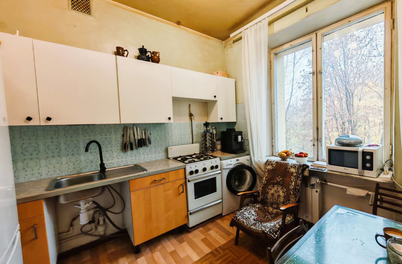 Квартира без ремонта, что дает вам возможность оформить ее на свой вкус. Из окон двух комнат и кухни вид на зеленые деревья во дворе, одно окно выходит на проспект Вернадского.
