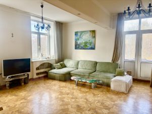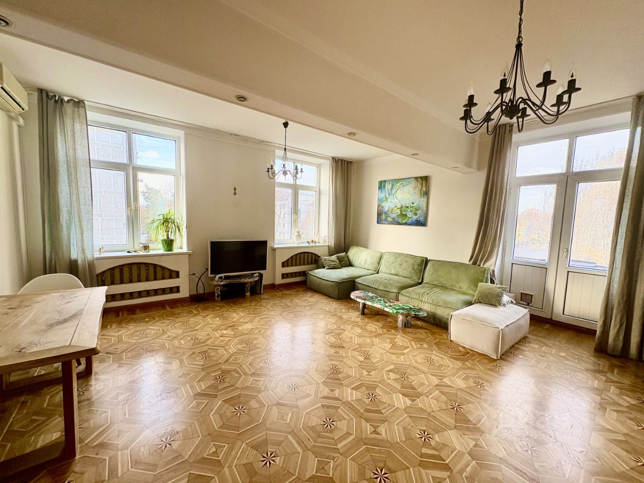 Большая гостиная 33 кв.м (выход из кухни и вход в коридор через итальянские распашные двери с витражными вставками), с художественным паркетом ручной работы (3 вида редких пород деревьев), балконом; два верхних света, два больших окна, потолки с побелкой (не натяжные).
