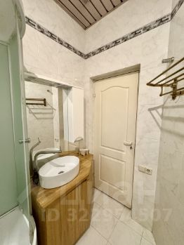 Ванная комната имеет новую сантехнику, ванну с душем, дубовый шкаф с овальной раковиной и нижним шкафом для белья.