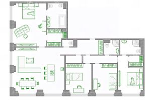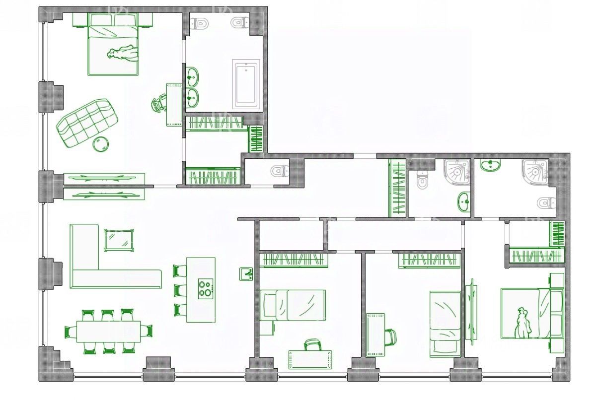 Планировка грамотно спланирована и продумано до мелочей: угловая кухня-гостиная-столовая, мастер-спальня с гардеробной и ванной комнатами, спальня с гардеробной и ванной комнатой, 2 спальни, ванная комната, гостевой с/у, постирочная. В квартире предусмотрено множество встроенных шкафов и систем хранения.