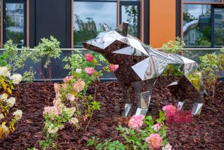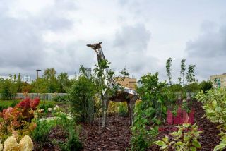 • Во дворе установлены уникальные скульптуры (жираф, заяц, волк), создающие особую атмосферу и подчёркивающие близость к музею Дарвина;