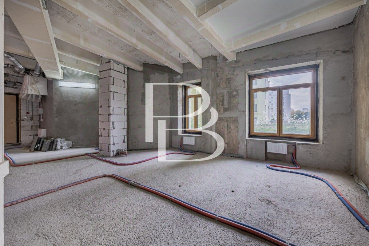 По плану возможно обустроить кухню-гостиную, две уютные спальни, одна из которых дополнена персональной ванной комнатой и гардеробной, гостевой санузел. Благодаря высоким потолкам 3.9 метра и восьми окнам в квартире очень светлая. В доме установлены новейшие инженерные системы.