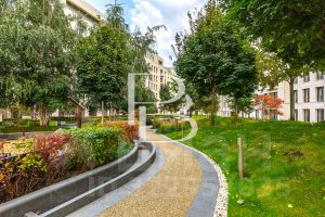 Главной достопримечательностью внутренней территории комплекса является просторный сад площадью 0,8 га, ландшафтная концепция которого была разработана британским бюро Gillespies. Сад озеленен многолетними деревьями, кустарниками, травами и цветами. Оборудованы аллеи, лаунж-зоны, фонтан и детская площадка от немецкой компании Richter Spielgeraete.